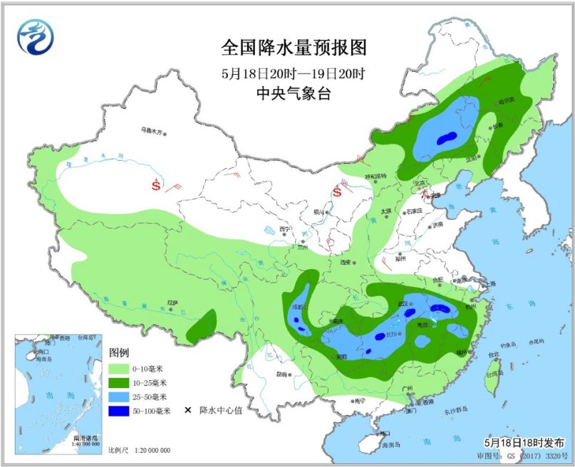 5月18日20時至19日20時,內(nèi)蒙古中東部、東北地區(qū)中部、四川盆地西部、西南地區(qū)東部、江漢、江南等地的部分地區(qū)有中到大雨,其中內(nèi)蒙古東南部、四川盆地西南部、湖南北部、湖北南部、安徽南部等地局地有暴雨(50~80毫米),上述部分地區(qū)有短時強(qiáng)降水,局部并伴有雷暴大風(fēng)等強(qiáng)對流天氣。西北地區(qū)中東部、內(nèi)蒙古大部、華北、東北等地的部分地區(qū)有5~7級風(fēng),局地陣風(fēng)8~9級。內(nèi)蒙古西部、南疆盆地等地有揚沙或浮塵天氣。