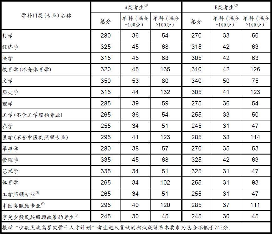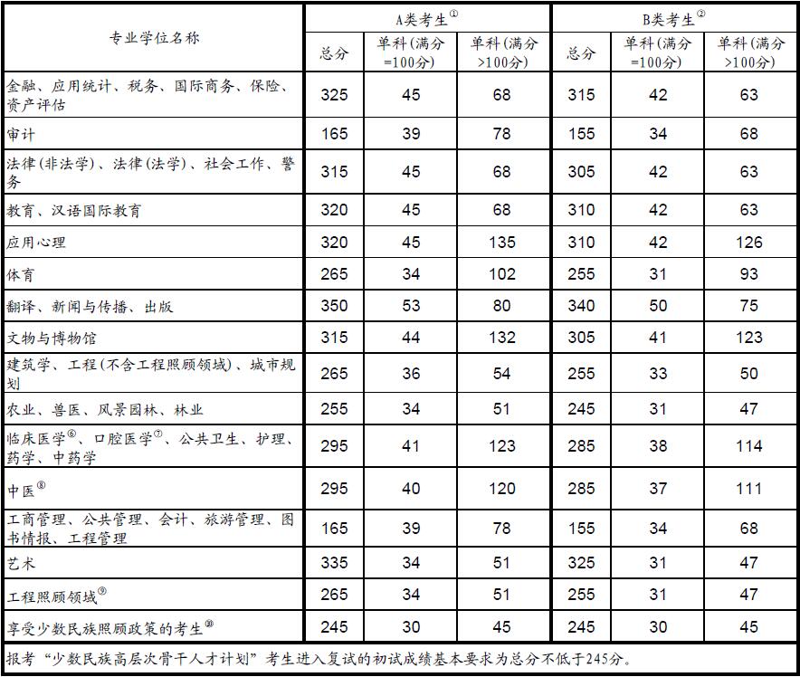 ⑥臨床醫(yī)學(xué)[1051]、⑦口腔醫(yī)學(xué)[1052]、⑧中醫(yī)[1057]專業(yè): 根據(jù)相關(guān)規(guī)定,“招生單位自主確定并對(duì)外公布報(bào)考本單位臨床醫(yī)學(xué)類專業(yè)學(xué)位碩士研究生進(jìn)入復(fù)試的初試成績(jī)要求,以及接受報(bào)考其他單位臨床醫(yī)學(xué)類專業(yè)學(xué)位碩士研究生調(diào)劑的成績(jī)要求。教育部劃定臨床醫(yī)學(xué)類專業(yè)學(xué)位碩士研究生初試成績(jī)基本要求供招生單位參考,同時(shí)作為報(bào)考臨床醫(yī)學(xué)類專業(yè)學(xué)位碩士研究生的考生調(diào)劑到其他專業(yè)的基本成績(jī)要求。”