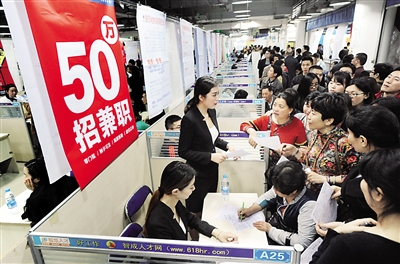 23日上午11點,重慶市江北區(qū)觀音橋一家人才招聘市場內(nèi),一個掛著“五十萬招兼職”海報的招聘展位前人頭攢動。排隊等候填表報名的人將兩米寬的過道塞得滿滿當當。