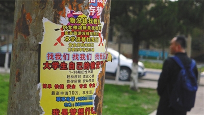 張貼在鄭州一大學校園內的校園網貸廣告。新京報記者 曹曉波 攝