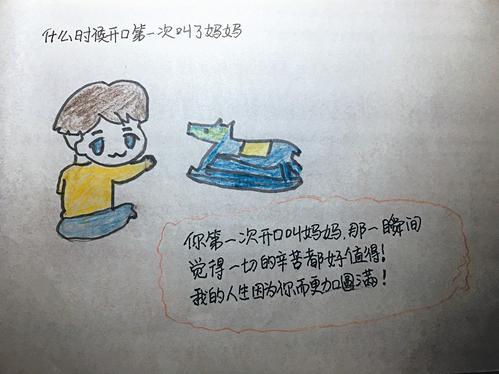 漫畫中,媽媽抱著襁褓里的嬰兒傷心地哭泣著,這是焦洋畫的漫畫中的一幅,是最揪心的一幅漫畫。旁邊配著焦洋用中性筆工工整整寫的大片文字?!耙驗榍闆r危急,媽媽早產(chǎn)一個月,你出生就要和媽媽分開,你被送去另一個醫(yī)院……媽媽每天祈禱,盼著你快快出院,終于在半個月后把你從醫(yī)院抱回來,那是媽媽第一次抱你,看著你個小人兒從此與我息息相關。仿佛那一瞬間明白了責任是什么,謝謝你寶貝,讓我邁入人生的另一個階段?!?br /> 焦洋今年33歲,在8年前,她生下兒子派派。孩子的出生并不順利,早產(chǎn)了一個月,因為缺氧,醫(yī)生甚至都建議家人放棄這條小生命。可是焦洋堅決不放棄,只要有一絲希望就得拼盡全力?!爸宦牭揭宦暱奁缶捅会t(yī)生抱走,放進保溫箱,我都沒看到他的模樣,讓我放棄,絕對不會同意的?!苯寡笳f,因為孩子一出生的狀況非常糟糕,她只好獨自出院,留下還在保溫箱里的孩子。
