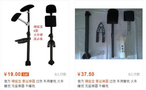 硬座寶。來(lái)源:淘寶網(wǎng)截圖。 從設(shè)計(jì)來(lái)看,硬座寶是一根支架,其正上方和側(cè)前方各有一個(gè)軟墊,正上方的軟墊用于擱置頭部,側(cè)前方的軟墊用于抵住胸部,其架子還能調(diào)節(jié)高度。這樣,坐著的人可以靠在上面睡覺(jué),避免趴在桌子上脖子酸痛、胳膊麻痹的情況。 只買(mǎi)到無(wú)座的人怎么辦?配上一只小板凳,硬座寶仍然能發(fā)揮作用。