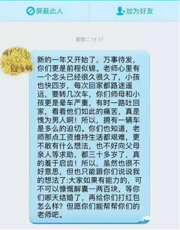 網(wǎng)帖中還上傳了數(shù)張疑似該老師與學(xué)生的QQ聊天截圖,其中的一張截圖中的對話道出了老師“眾籌”買車的原因:“新的一年又開始了,萬事待發(fā),你們更是前程似錦。老師心里有個念頭已經(jīng)很久了,小孩也快四歲了,每次回家都路途遙遠(yuǎn),要轉(zhuǎn)幾次車,你們師母和小孩更是暈車嚴(yán)重,有時一路吐回家,看看他們?nèi)绱送纯?,真是愧為男人??!所以,擁有一輛車是多么的迫切。你們也知道老師那些工資維持生活都很艱難,更不敢有什么想法,也不好向父母親人求助,都三十多歲了,真的羞于啟齒!所以,雖然也很不好意思,但是也只能跟你們說說我的想法了:大家如果有能力的,可不可以慷慨解囊一兩百塊,等你們哪天結(jié)婚了,再給你們打紅包怎么樣?但愿你們能幫幫你們的老師吧?!?/p>