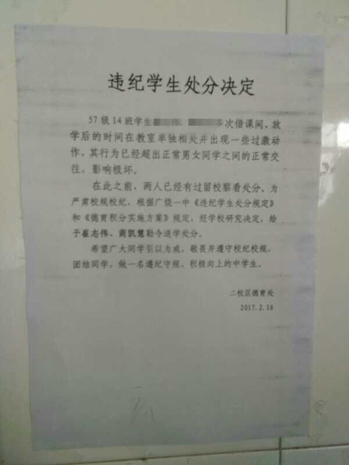 17日晚,商先生向大眾網(wǎng)記者提供了一份落款為二校區(qū)德育處的違紀學生處分決定,大體內容為:57級14班學生阿強(化名)、小芳多次借課間、放學后的時間在教室單獨相處并出現(xiàn)一些過激動作,其行為已經(jīng)超出正常男女同學之間的正常交往,影響極壞。在此之前,兩人已經(jīng)有過留校察看處分。為嚴肅校規(guī)校紀,根據(jù)廣饒一中《違紀學生處分規(guī)定》和《德育積分實施方案》規(guī)定,經(jīng)學校研究決定,給予兩人勒令退學處分。