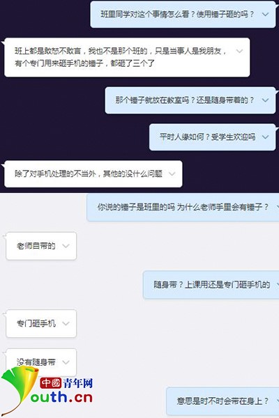 另一位目睹當(dāng)晚情況的同學(xué)向中國青年網(wǎng)記者反映,手機(jī)是被老師拿錘子砸的,該老師男性,其專門備有一個(gè)砸手機(jī)的錘子。雖然老師平時(shí)對學(xué)生們很嚴(yán)厲,但教學(xué)水平很不錯(cuò)。這次雖然學(xué)生有錯(cuò),但老師砸手機(jī)的處理方式有些欠妥。