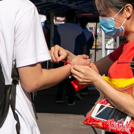 7月7日上午,北京市陳經(jīng)綸中學(xué)門口,一位老師為考生戴上代表幸運(yùn)的紅手鏈。中青報(bào)·中青網(wǎng)見(jiàn)習(xí)記者 曲俊燕/攝