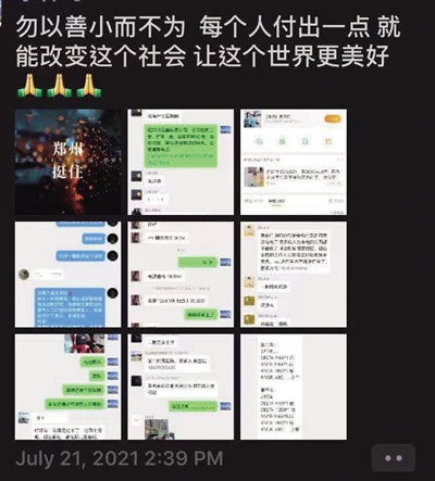 20日晚9點26分,她和兩個朋友創(chuàng)建了第一個微信群:鄭州求助信息匯總。不到半小時,群里就涌進了近400人,他們間多是陌生人,復制、粘貼各處看到的求助和救援信息,轉發(fā)到微博、微信群和朋友圈。群里的消息,就像當晚的大雨一樣,幾十秒時間,就有三四十條。