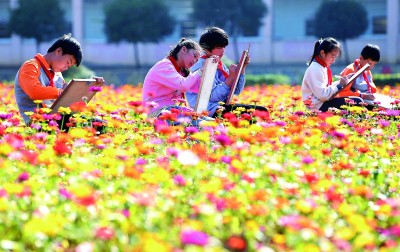 江西宜春市袁州區(qū)寨下鎮(zhèn)中心小學(xué)的學(xué)生們在花田寫生。新華社發(fā)