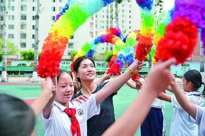 河北省邯鄲市邯山區(qū)農林路小學,老師和學生一起參加活動。李昊攝/光明圖片