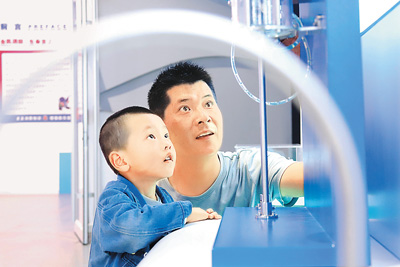 家長和孩子在甘肅省張掖市科技館觀察力學原理展示。王 將攝(人民視覺)