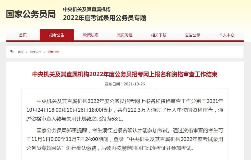 據(jù)國家公務(wù)員局網(wǎng)站消息,中央機(jī)關(guān)及其直屬機(jī)構(gòu)2022年度公務(wù)員招考網(wǎng)上報名和資格審查工作分別于2021年10月24日18:00和10月26日18:00結(jié)束,共有212.3萬人通過了用人單位的資格審查,通過資格審查人數(shù)與錄用計劃數(shù)之比約為68:1。