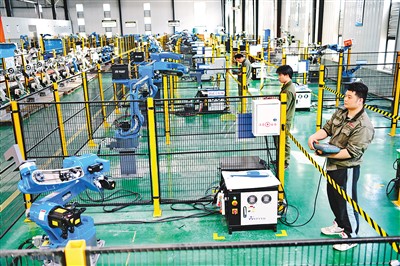 近年來,江西省贛州市加強青年技術(shù)人才技能培訓,促進適齡青年實現(xiàn)技能成才。圖為贛州市贛縣區(qū)的一家智能裝備制造企業(yè)內(nèi),幾名青年技工在加緊調(diào)試出口的工業(yè)機器人訂單產(chǎn)品。朱海鵬攝(人民視覺)