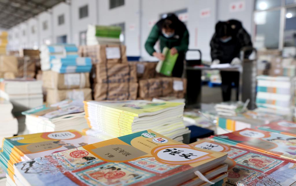 2022年2月13日,在山東省棗莊市新華書店教材發(fā)行中心,工作人員在分揀教材。新華社發(fā)
