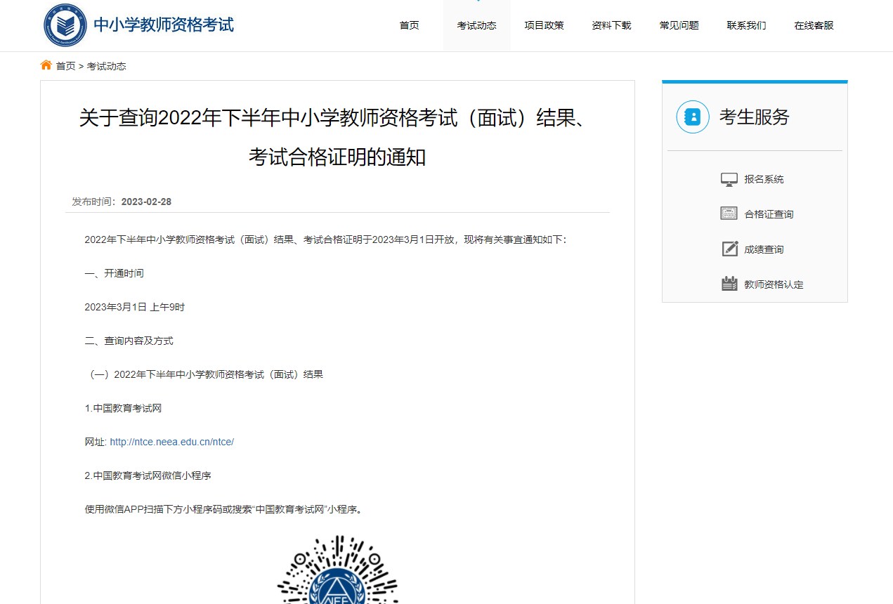 2022年下半年中小學(xué)教師資格考試(面試)結(jié)果、考試合格證明于2023年3月1日開放,現(xiàn)將有關(guān)事宜通知如下: