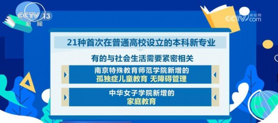 21種首次在普通高校設立的本科新專業(yè),有的與社會生活需要緊密相關,比如南京特殊教育師范學院新增的孤獨癥兒童教育、無障礙管理,中華女子學院新增的家庭教育;有的與城鄉(xiāng)建設緊密相關,比如海南大學新增的鄉(xiāng)村治理,北京林業(yè)大學新增的國家公園建設與管理;還有的與前沿技術發(fā)展緊密相關,比如,清華大學新增的地球系統科學,華南理工大學新增的生物材料,東南大學新增的未來機器人、電動載運工程。
