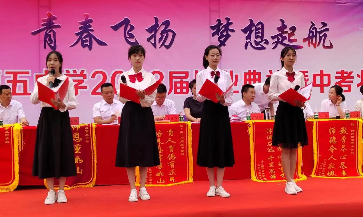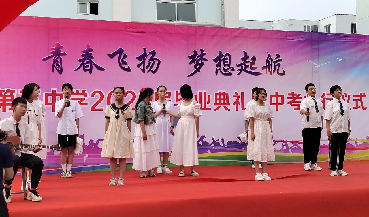 在這分別之際,張倩睿同學宣讀《致母校的一封信》,代表全體初三學子以鏗鏘誓言報答母校的培育之恩:親愛的五中,我的母校,您的關(guān)懷和栽培我沒齒難忘,明日我們在陽光下重逢,您會發(fā)展的越來越好,而我也將成為您的驕傲!