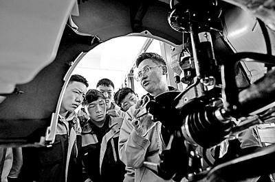 9月8日,在青海省果洛藏族自治州職業(yè)技術(shù)學(xué)校,汽車運用與維修專業(yè)學(xué)生在實訓(xùn)課程上學(xué)習(xí)。 新華社發(fā)