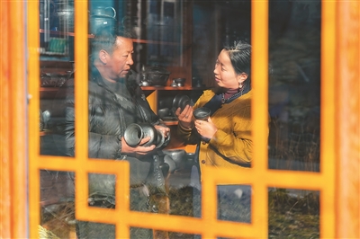 在德格縣麥宿鎮(zhèn)的扎堪倉黑陶工坊,達瓦卓瑪(右)向工坊主理人降擁格乃了解工坊近期的經(jīng)營情況以及新品研制進展。新華社記者 沈伯韓攝