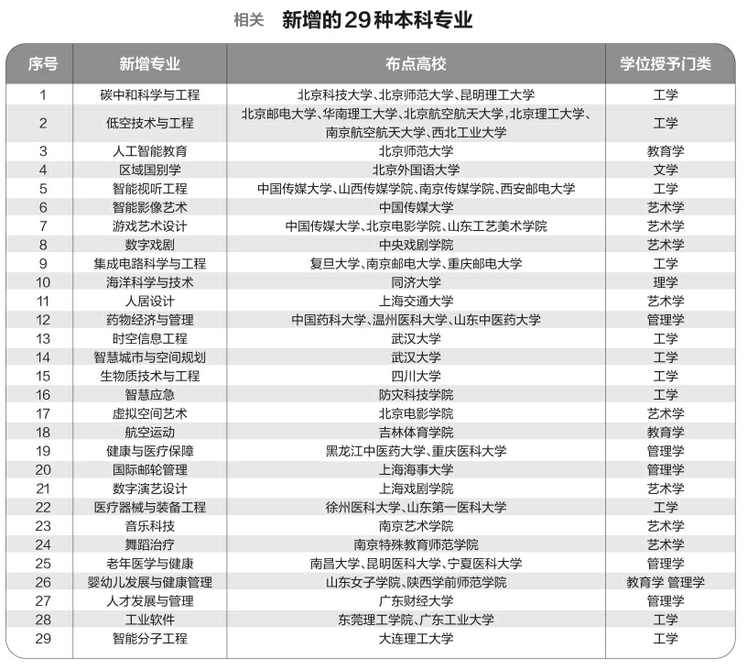 據(jù)悉,此次增設(shè)的29種新專業(yè),充分體現(xiàn)國家戰(zhàn)略、市場需求和科技發(fā)展?fàn)恳?,在服?wù)國家戰(zhàn)略方面,增設(shè)了區(qū)域國別學(xué)、碳中和科學(xué)與工程、海洋科學(xué)與技術(shù)、健康與醫(yī)療保障等專業(yè);面向科技發(fā)展前沿,增設(shè)了智能分子工程、醫(yī)療器械與裝備工程、時空信息工程等專業(yè);主動適應(yīng)市場需求,增設(shè)了國際郵輪管理、航空運動等專業(yè)。同時,聚焦人工智能賦能經(jīng)濟社會發(fā)展,增設(shè)人工智能教育、智能視聽工程、數(shù)字戲劇等專業(yè)。