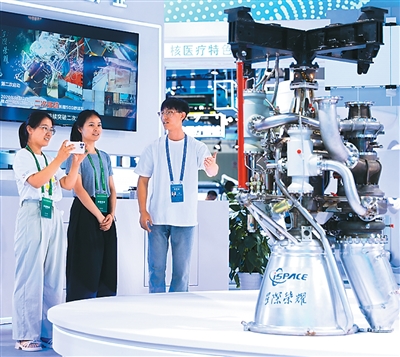 展區(qū)內(nèi),工作人員介紹焦點一號15噸液氮甲烷發(fā)動機(jī)。陳冬冬攝