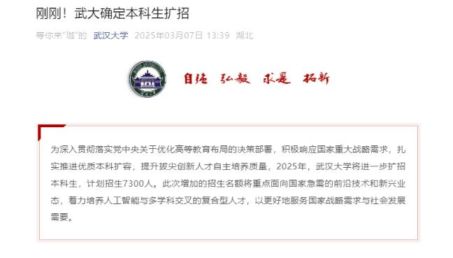 3月7日,據(jù)武漢大學(xué)微信公眾號(hào)消息,為深入貫徹落實(shí)黨中央關(guān)于優(yōu)化高等教育布局的決策部署,積極響應(yīng)國家重大戰(zhàn)略需求,扎實(shí)推進(jìn)優(yōu)質(zhì)本科擴(kuò)容,提升拔尖創(chuàng)新人才自主培養(yǎng)質(zhì)量,2025年,武漢大學(xué)將進(jìn)一步擴(kuò)招本科生,計(jì)劃招生7300人。此次增加的招生名額將重點(diǎn)面向國家急需的前沿技術(shù)和新興業(yè)態(tài),著力培養(yǎng)人工智能與多學(xué)科交叉的復(fù)合型人才,以更好地服務(wù)國家戰(zhàn)略需求與社會(huì)發(fā)展需要。