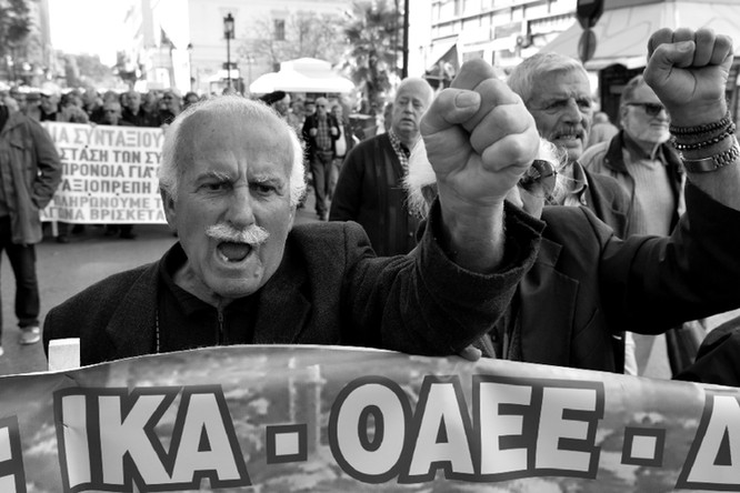 3月10日,雅典街頭,希臘人集會抗議養(yǎng)老金改革。