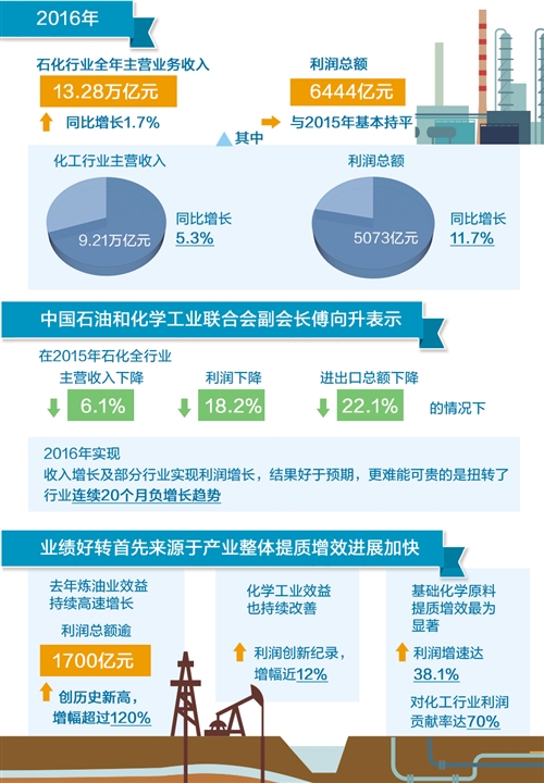 來自中國石油和化學(xué)工業(yè)聯(lián)合會的信息顯示,2016年,石化行業(yè)全年主營業(yè)務(wù)收入13.28萬億元,同比增長1.7%,利潤總額6444億元,與2015年基本持平;其中化工行業(yè)主營收入9.21萬億元、同比增長5.3%,利潤總額5073億元、同比增長11.7%。中國石油和化學(xué)工業(yè)聯(lián)合會副會長傅向升表示,在2015年石化全行業(yè)主營收入下降6.1%、利潤下降18.2%、進(jìn)出口總額下降22.1%的情況下,2016年實(shí)現(xiàn)收入增長及部分行業(yè)實(shí)現(xiàn)利潤增長,結(jié)果好于預(yù)期。更難能可貴的是,扭轉(zhuǎn)了行業(yè)連續(xù)20個月負(fù)增長趨勢。