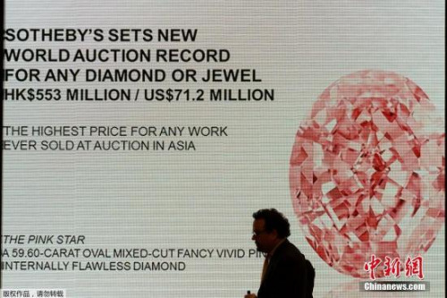 中新網(wǎng)4月5日電 據(jù)外媒報道,近日,重達(dá)59.60克拉、一顆被稱為“粉紅之星”的罕見鉆石在香港拍賣的價格超過了7100萬美元,刷新了全球鉆石的拍賣紀(jì)錄。
