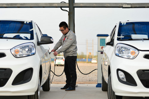 資料圖片:4月13日,河北省清河縣一家新能源汽車(chē)公司的工人在為新生產(chǎn)的電動(dòng)汽車(chē)充電。新華社發(fā)