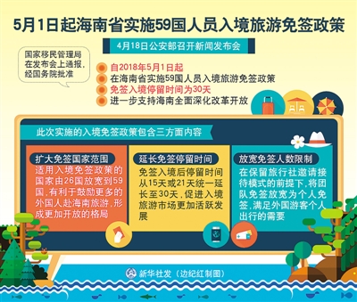 “擴大免簽國范圍;延長免簽停留時間;放寬免簽人數限制?!?月18日,公安部在京召開新聞發(fā)布會,國家移民管理局在發(fā)布會上通報:經國務院批準,自2018年5月1日起,在海南省實施59國人員入境旅游免簽政策,進一步支持海南全面深化改革開放。