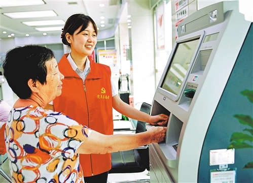 湖南邵陽農(nóng)商銀行黨員志愿者向客戶介紹銀行查詢機(jī)使用方法。滕治中攝(中經(jīng)視覺)