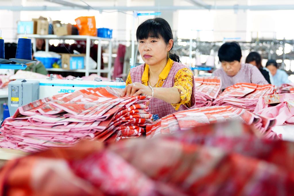 4月13日,在曹縣有愛(ài)云倉(cāng)漢服基地,工作人員在加工馬面裙。新華社記者 郭緒雷 攝