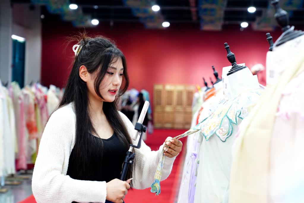 “85后”的黃曉燕曾在南方打拼十余年,如今成為曹縣穿越大唐漢服云倉(cāng)經(jīng)理?!半m然是在鄉(xiāng)鎮(zhèn)工作,但貼近市場(chǎng),節(jié)奏非??欤刻祛櫩徒j(luò)繹不絕?!彼谡箯d里邊走邊介紹,公司自主設(shè)計(jì)的漢服涵蓋唐、宋、明、清等品類(lèi),并根據(jù)人們?nèi)粘Vb特點(diǎn)加以改良。在這里,不僅能夠私人訂制服裝,還有AI直播改善線(xiàn)上消費(fèi)體驗(yàn)。