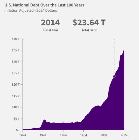 △美國財(cái)政部下屬的財(cái)務(wù)數(shù)據(jù)網(wǎng)站披露的數(shù)據(jù)顯示,美國國債總額從2014年的23.64萬億美元升至2024年的超36萬億美元,漲幅超52%,這一趨勢整體上仍在持續(xù)加快。
