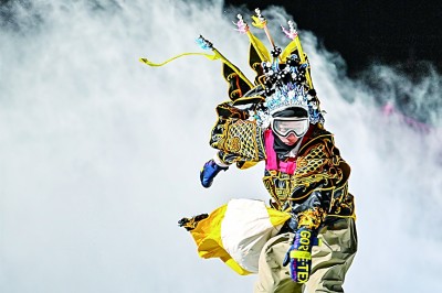 身穿京劇服飾的滑雪愛(ài)好者在吉林松花湖滑雪場(chǎng)滑雪。新華社發(fā)