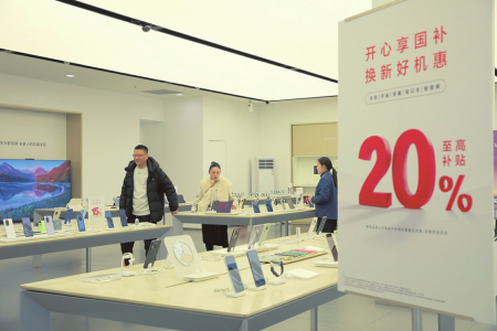 2月27日,太原市杏花嶺區(qū)一數(shù)碼產品店內,“國補”海報擺放在醒目位置,前來咨詢購買的市民絡繹不絕。隨著2025年“國補”政策持續(xù)深入實施,省城消費市場迎來一波“換機熱”。本報記者王瑞瑞攝