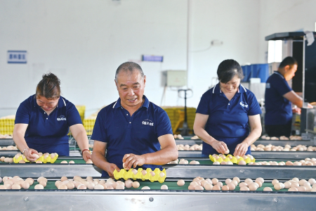 在雞舍集蛋臺(tái)前檢驗(yàn)雞蛋。