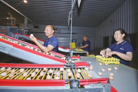 雞蛋通過(guò)自動(dòng)分級(jí)機(jī)流向預(yù)先設(shè)定規(guī)格標(biāo)準(zhǔn)的生產(chǎn)線,工作人員再將大小一致的雞蛋收集碼盤(pán)。