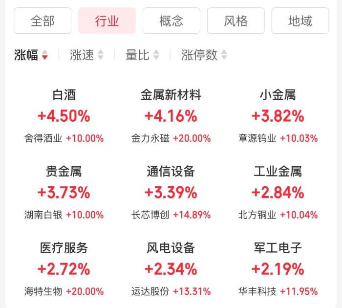 盤面上,白酒、金屬新材料、通信設(shè)備等行業(yè)板塊漲幅居前。概念板塊方面,稀土永磁概念大漲,帶動金力永磁、中鋼天源、領(lǐng)益智造等相關(guān)個股漲停;另,F(xiàn)5G概念、金屬鉛等表現(xiàn)亮眼。
