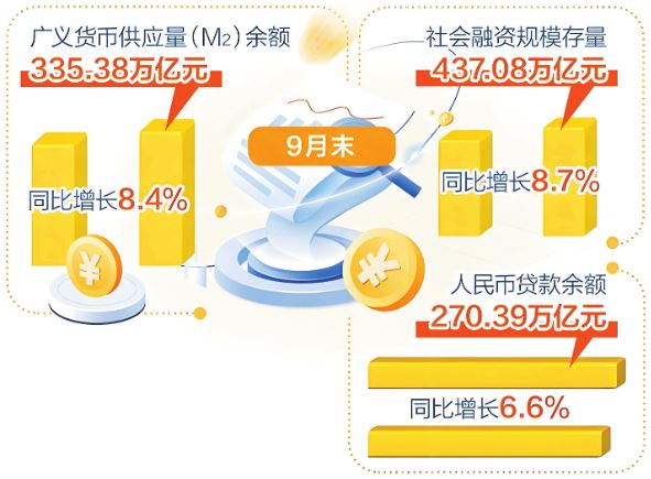9月末,M2余額335.38萬億元,同比增長8.4%,在上年同期高基數(shù)背景下,仍保持較高增速;社會(huì)融資規(guī)模存量437.08萬億元,同比增長8.7%,比上年同期高0.7個(gè)百分點(diǎn);前三季度,社會(huì)融資規(guī)模增量累計(jì)為30.09萬億元,同比多增4.42萬億元。
