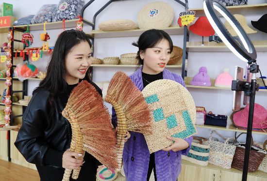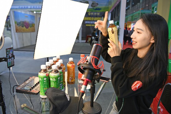 10月11日,甘肅隴南市西和縣消費(fèi)扶貧直銷店,供銷社工作人員正在直播帶貨拓展“線上”農(nóng)產(chǎn)品銷售。李旭春攝(人民視覺(jué))