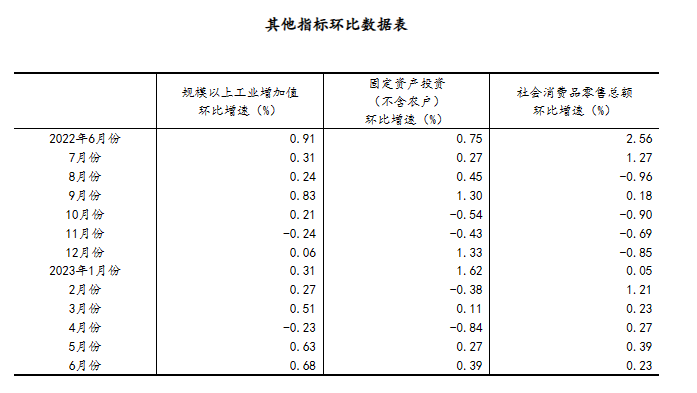 (2)根據(jù)季節(jié)調(diào)整模型自動(dòng)修正結(jié)果,對(duì)近一年來各期國(guó)內(nèi)生產(chǎn)總值、規(guī)模以上工業(yè)增加值、固定資產(chǎn)投資(不含農(nóng)戶)、社會(huì)消費(fèi)品零售總額環(huán)比增速進(jìn)行修訂。修訂結(jié)果及2023年二季度GDP環(huán)比數(shù)據(jù)、2023年6月份其他指標(biāo)環(huán)比數(shù)據(jù)如下: