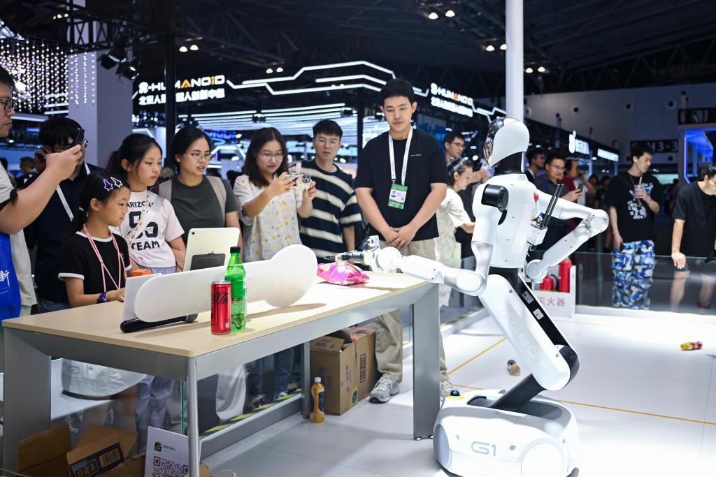 7月29日,上海2025世界人工智能大會,參觀者在觀賞一款可用于零售、工業(yè)等多種場景的機(jī)器人。新華社記者 陳浩明 攝