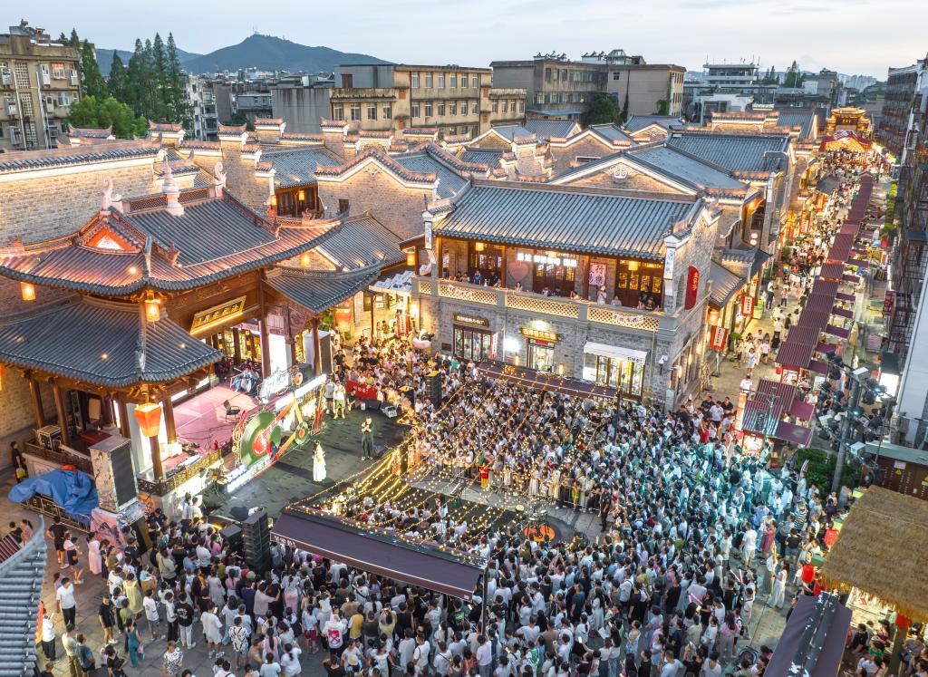 7月25日,游客在湖北省襄陽古城管家巷文化休閑街區(qū)觀看星光音樂會(無人機(jī)照片)。新華社發(fā)(楊東攝)