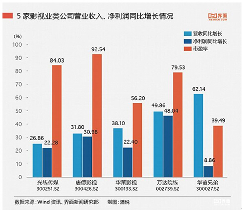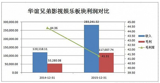 據(jù)界面報(bào)道,根據(jù)財(cái)報(bào)顯示,華誼兄弟2015年影視娛樂版塊營(yíng)業(yè)收入較上年同期相比增135.80%,達(dá)到28.32億元,營(yíng)業(yè)成本較上年同期增長(zhǎng)135.80%,達(dá)到16.62億,毛利率較上年減少了3.05%,達(dá)到41.35%。在報(bào)告期內(nèi),公司上映的主要是《奔跑吧兄弟》《天將雄師》《梔子花開》、《命中注定》《尋龍?jiān)E》《老炮兒》等16部,電影的總票房約43億。