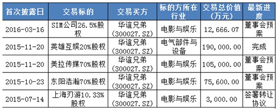 據(jù)和訊股票報(bào)道,2015年10月22日,華誼兄弟以7.56億元收購(gòu)浙江東陽(yáng)浩瀚影視娛樂有限公司(以下稱“東陽(yáng)浩瀚”)的藝人股東或藝人經(jīng)紀(jì)管理人合計(jì)持有的70%股權(quán)。主要經(jīng)營(yíng)業(yè)務(wù)包括影視劇項(xiàng)目的投資、制作和發(fā)行,藝人衍生品業(yè)務(wù)的開發(fā)和經(jīng)營(yíng),而此次收購(gòu)所涉及的藝人包括李晨、馮紹峰、Angelababy、鄭愷、杜淳、陳赫共6人。