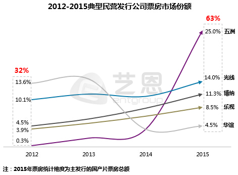 根據(jù)藝恩研究報(bào)告顯示,華誼兄弟從2012年的13.6%的市場(chǎng)份額一路跌至2015年的4.5%,而由萬(wàn)達(dá)影視牽頭的五洲發(fā)行市場(chǎng)份額一路從0.3%飆升至25%,華誼的電影份額被一路碾壓。而萬(wàn)達(dá)影視也即將以注入上市公司的方式登陸A股市場(chǎng)。