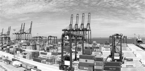 科倫坡南港集裝箱碼頭是中國和斯里蘭卡共建“21世紀(jì)海上絲綢之路”務(wù)實對接標(biāo)桿性項目,是南亞最深的集裝箱碼頭。據(jù)測算,南港碼頭項目在35年合同期直接稅賦將達18億美元。同時,在建設(shè)和經(jīng)營期間可分別為當(dāng)?shù)貏?chuàng)造3000個和7500個直接就業(yè)機會。圖為科倫坡南港集裝箱碼頭。 新華社發(fā)