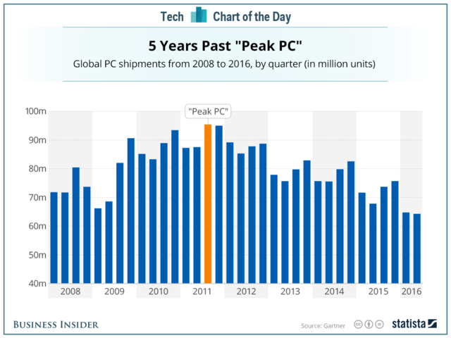 英特爾所有的改變?cè)醋匀找嫖s的PC市場(chǎng)。美國投資銀行Bernstein分析師斯塔西雷斯根(Stacy Rasgon)表示,PC芯片是英特爾最大的營收來源,但其最終意識(shí)到,在PC行業(yè)不景氣的新常態(tài)下,必須尋找其他創(chuàng)收增長(zhǎng)引擎。