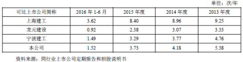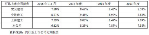2013年至2016年6月,重慶建工實現(xiàn)毛利365,161.26萬元、345,832.10萬元、381,910.45萬元、141,170.84萬元。綜合毛利率略低于同行業(yè)可比上市公司的平均水平,重慶建工綜合毛利率分別為7.38%、7.89%、8.29%、6.62%。